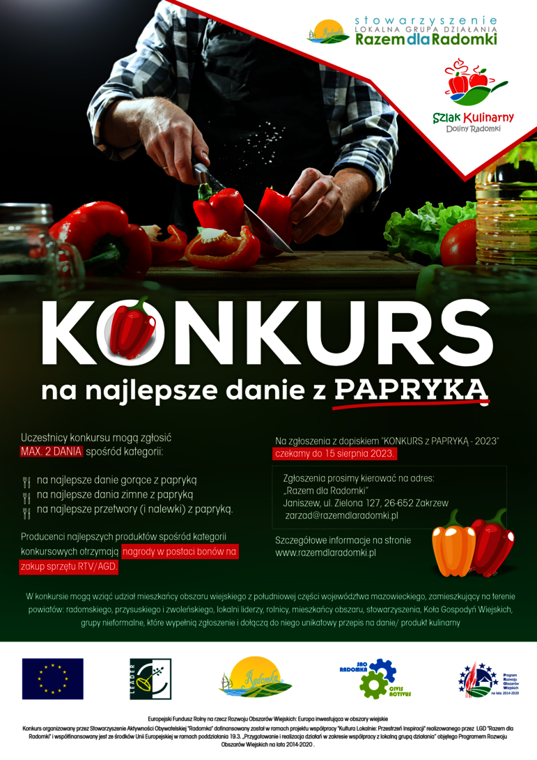 Stowarzyszenie Aktywności Obywatelskiej „RADOMKA wspólnie z partnerem Lokalną Grupą Działania „Razem dla Radomki” zaprasza lokalnych liderów, mieszkańców obszaru, stowarzyszenia, Koła Gospodyń Wiejskich, grupy nieformalne, do udziału w konkursie kulinarnym na najlepszą potrawę lokalną przygotowaną z papryką.