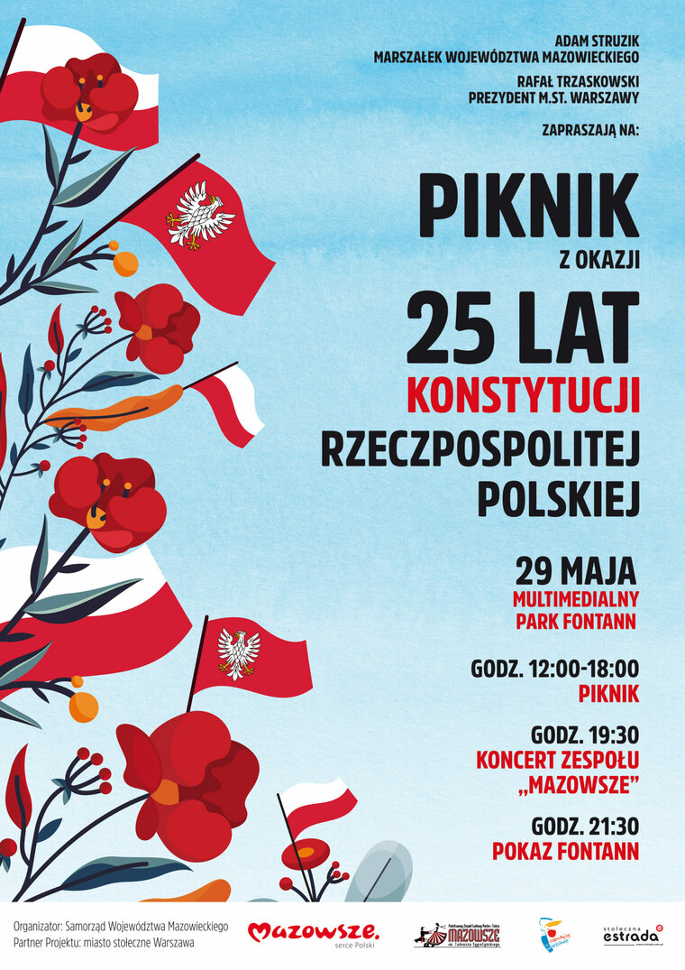 Piknik z okazji 25 lecia Konstytucji organizowany jest przez Marszałka Województwa Mazowieckiego Pana Adama Struzika oraz Prezydenta M.ST. Warszawy Pana Rafała Trzaskowskiego.
