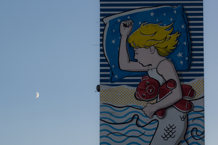 „Śpiąca Syrenka [mural autorstwa Zuzanny Podlewskiej sfotografowany o zachodzie słońca]”, zdjęcie przedstawia budynek mieszkalny na warszawskim Ursynowie przy ul. Teligi 2.